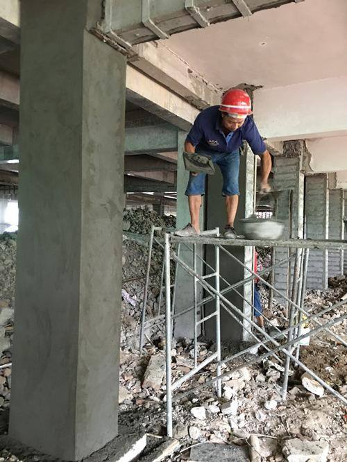 準備好必要的工具及養護物品確定修補區域,期修補處理范圍應比實際破損范圍向外擴大100mm,切割或剔鑿出混凝土修補區域的垂直邊緣,期深度≥5mm,以免修補區域邊緣薄片化。將修補區域混凝土基層表面浮塵、油污清理干凈,并剔除疏松部分。清理修補區域內鋼筋表面的繡質和雜物。將清理好的修補區域內混凝土基層進行鑿毛處理或用混凝土界面處理劑進行界面處理。用氣泵或水將處理過的修補區域內混凝土基層表面清掃干凈。進行下道工序不得有明水存留,接推薦加水量10-20%(重量比)的配合比攪拌高強修補砂漿。采用機械攪拌2-3分名目即可并在利于攪拌的質量和速度,人工攪拌應在5分名目以保證攪拌均勻。拌好的高強修補砂漿即可進行抹灰。一次抹灰厚度不宜超過15-20mm。若抹灰層較厚,應采用分層多次抹灰的施工方法。由于高強修補砂漿含有多種分子聚合物改性外滲料及膠粉,使拌合好的高強修補砂漿膠粘稠,抹灰是應保持刀光潔。對于表面需壓光處理的,最外層抹灰應拌合略稀,并掌握好時間,以利用壓光處理。嚴禁在高強修補砂漿中摻入任何外加劑或外摻料。使用溫度為-5℃-40℃